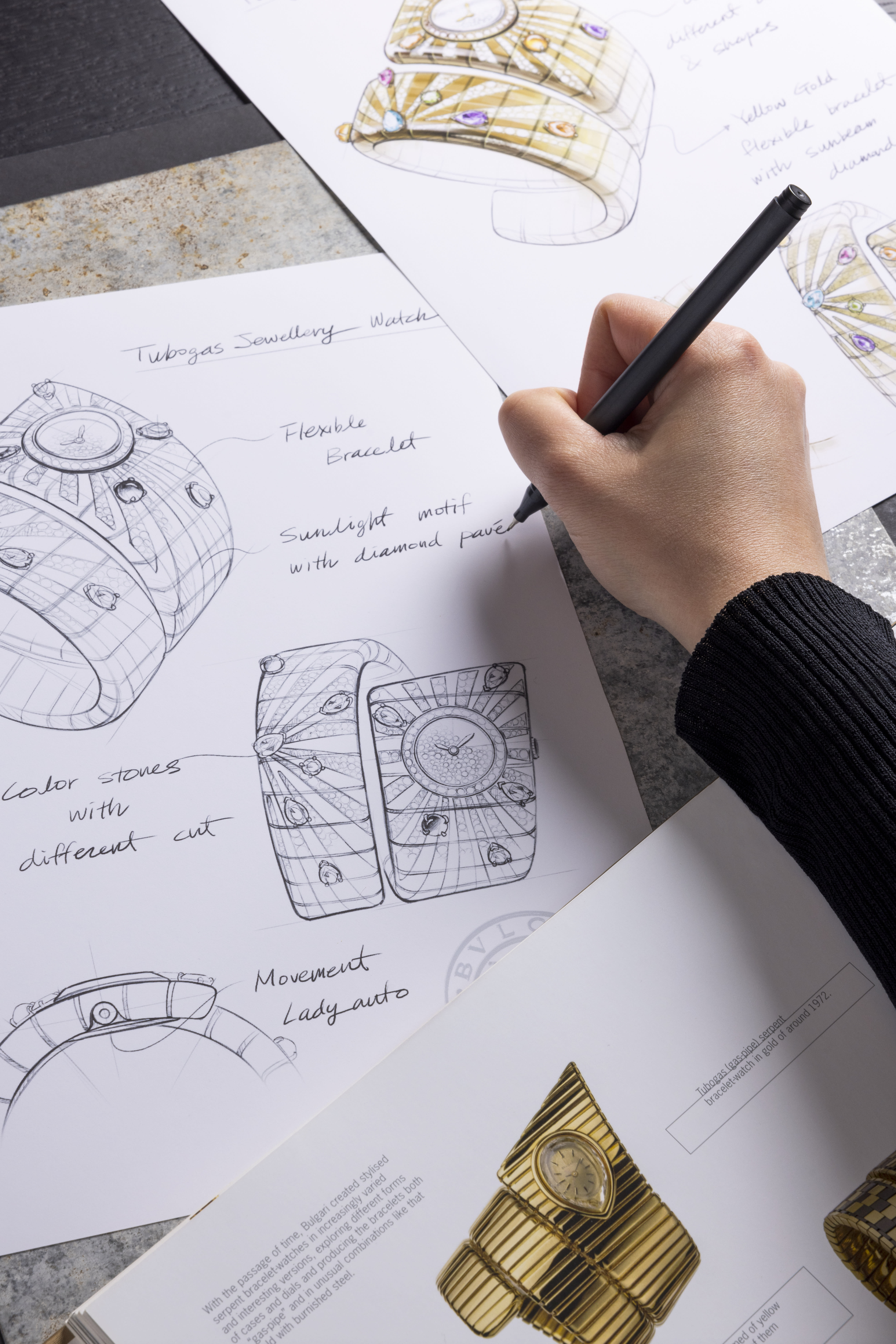 Tubogas Manchette腕表以18K黄金、钻石与缤纷宝石大胆交织,呈现夺目风采,焕新演绎1974年的典藏设计。表盘与宽幅单圈表链相辅相成,黄水晶、红碧玺、橄榄石、紫水晶、托帕石和锰铝榴石熠熠生辉,与近12克拉的钻石璀璨映衬。这枚珠宝腕表通过创新模块化结构保留Tubogas系列标志性的柔性特质,并搭载Lady Solotempo Automatic BVS100机芯,将意式魅力与瑞士机械精工融为一体。